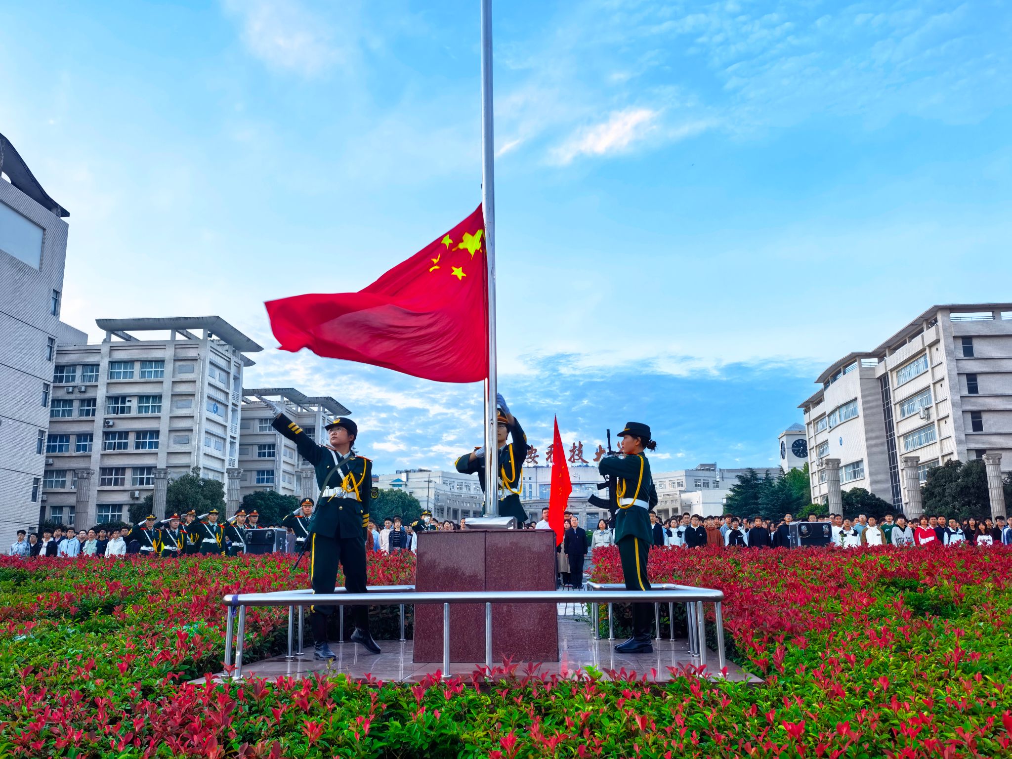 10月13日清晨,临潼校区骊山校园中心广场举行升国旗仪式,马克思主义学院红言宣讲团讲师张丹丹作国旗下主题宣讲。