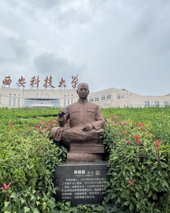 在西安科技大学图书馆前的茵茵草丛间,绿意轻轻环绕着一尊青铜雕像。袁耀庭先生端坐于堆叠的书卷之上,目光穿越岁月仍显深邃坚定——这尊雕像不仅凝固着先生的儒雅风骨,更镌刻着西科地质学科的拓荒岁月,承载着一代学人薪火相传的精神力量。