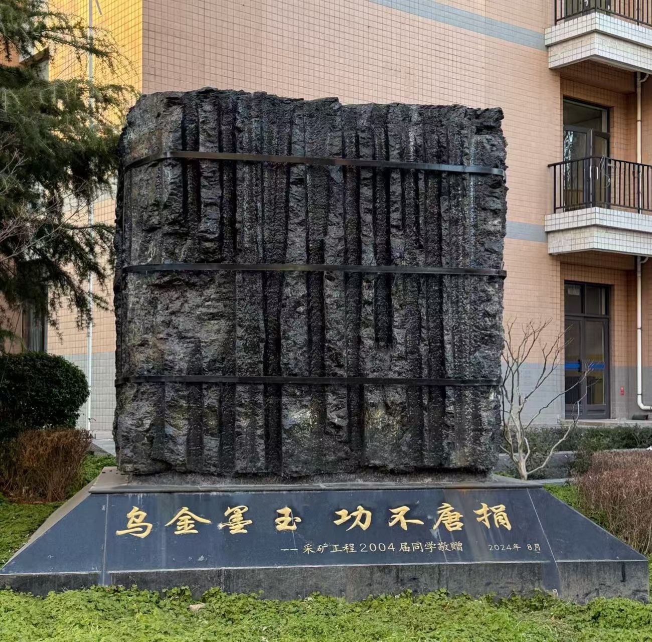 驻足凝视,煤立方雕塑的原生煤体黝黑深邃,天然的层理纹路仿佛是大地深处的年轮,将亿万年的时光凝固其中。基座上的“乌金墨玉”象征着煤炭的色泽与质地,同时也寓意着西安科技大学采矿师生朴实无华、吃苦耐劳的精神风貌。“功不唐捐”则强调了努力与付出的价值,坚信每一分耕耘都将收获相应的回报。这一理念不仅是2004届采矿工程学生的自我鞭策,也是对全体采矿工程师生的激励,更是对所有致力于煤炭行业发展进步者的崇高敬意。